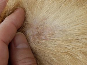 四肢に目が行きますが、必ず他の部分も拝見します。なるほど、背中にも脱毛跡や鱗屑(フケ)があり、炎症や色素沈着があります。