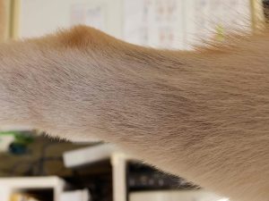 四肢に目が行きますが、必ず他の部分も拝見します。なるほど、背中にも脱毛跡や鱗屑(フケ)があり、炎症や色素沈着があります。