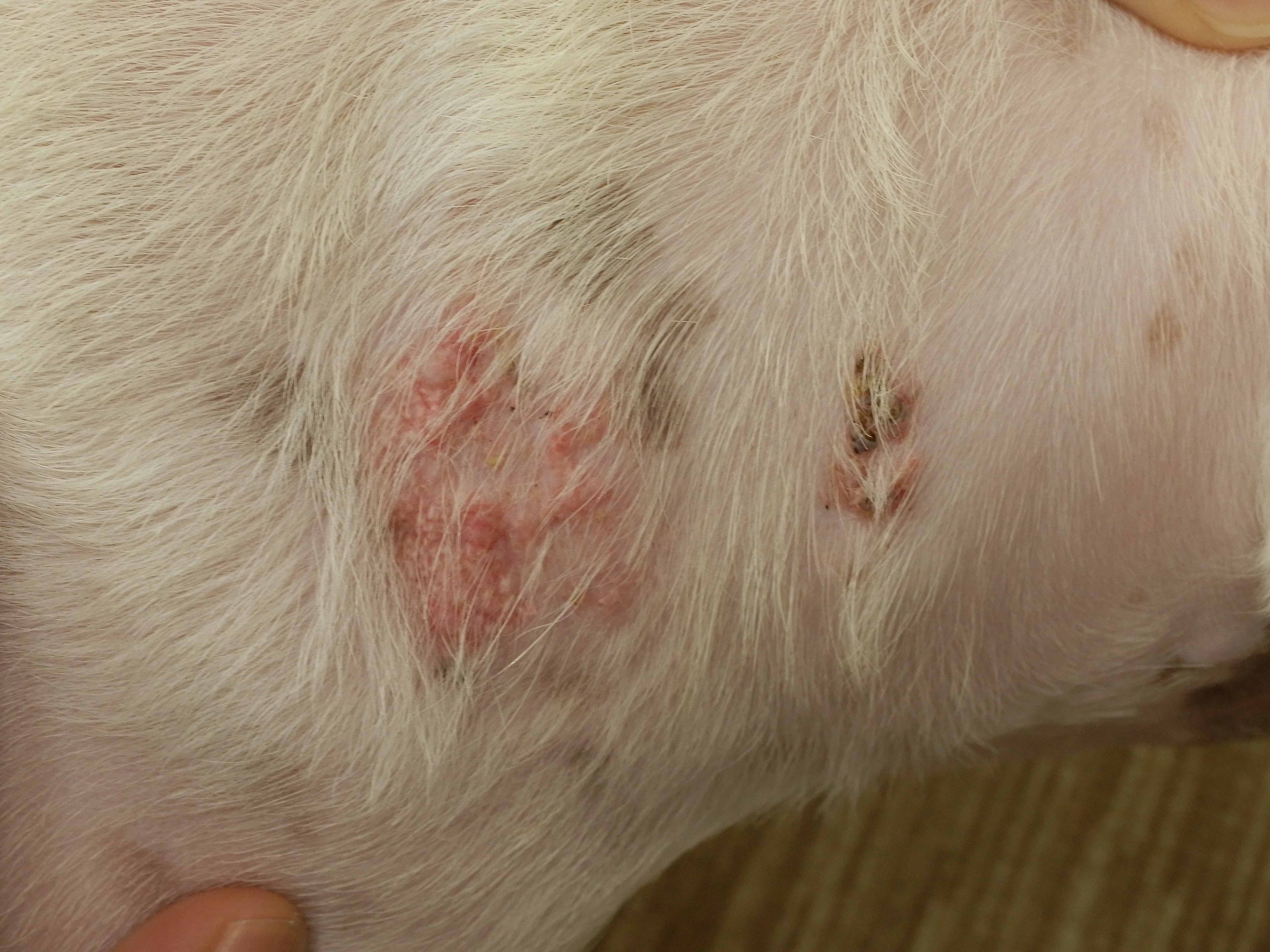 この肩の部分は典型的症状なので「黄色枠の写真の膿皮症」みたいに普通の膿では無いだろう自信がありました。