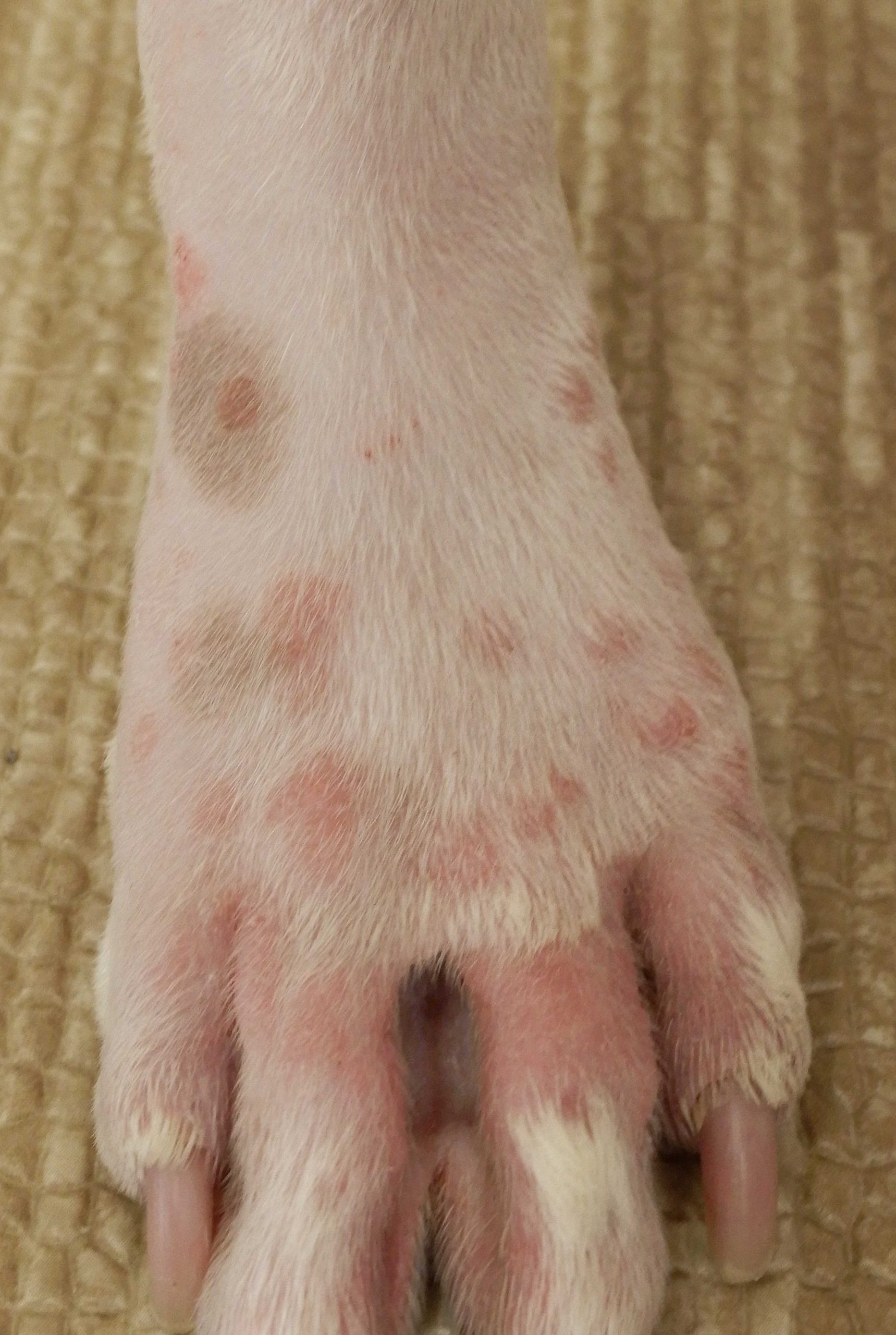 でも不思議なのはお腹の膿皮症と足先の症状です。お腹もポツポツと気になりますが、特に手足の先は・・・ひょっとして本当に難治性の糸状菌感染なのでしょうか?元の病気がアレなら二次的にそうなる可能性はあるのですが。