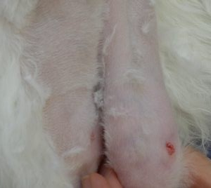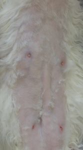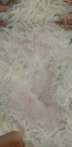 ご家族の発見した部分の一番下が目立つのですが(後述する病気の特徴としてそうです)、実は乳腺は全体に妊娠している様に張っています。こういうのも毛刈りをする事で更によく確認できます(もちろんしたくない場合はしなくても大丈夫です)。